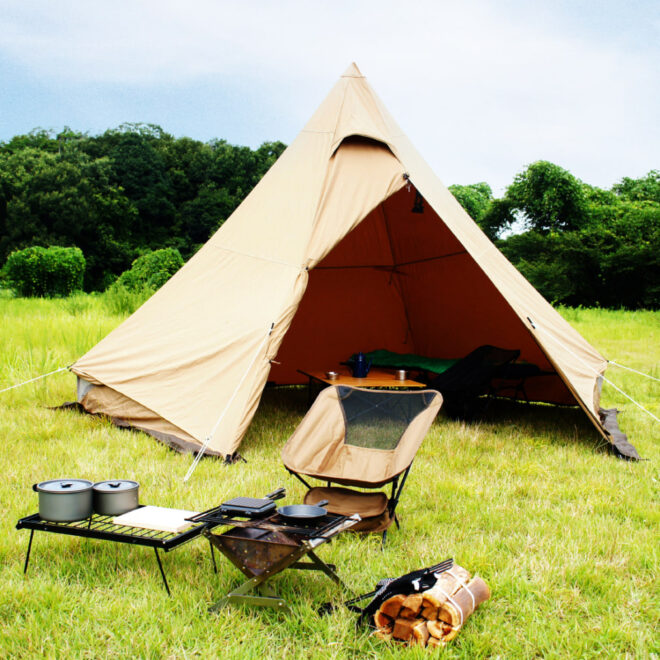 1本のポールで立ち上がるので設営しやすく、薪ストーブを設置すれば冬キャンプも楽しめます。